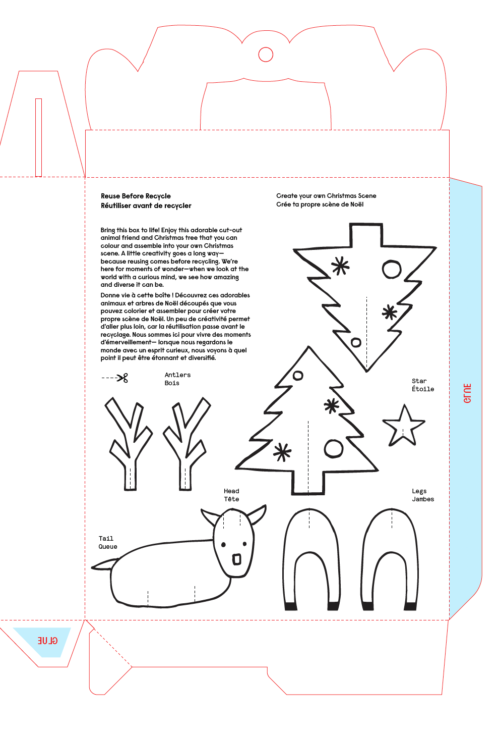 - Reuse Before Recycle: the inner of the product box is printed for you to colour and create a Christmas scene.